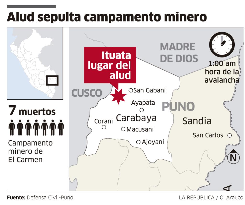 Un alud, producto de las fuertes lluvias en el sur del país, arrasó con un campamento minero informal en Puno, provocando la muerte de siete personas.