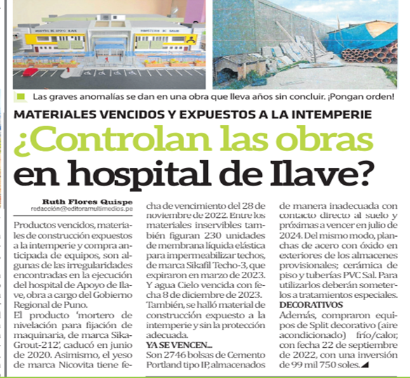 Productos vencidos, materiales de construcción expuestos a la intemperie y compra anticipada de equipos, son algunas de las irregularidades encontradas en la ejecución del hospital de Apoyo de Ilave, obra a cargo del Gobierno Regional de Puno.