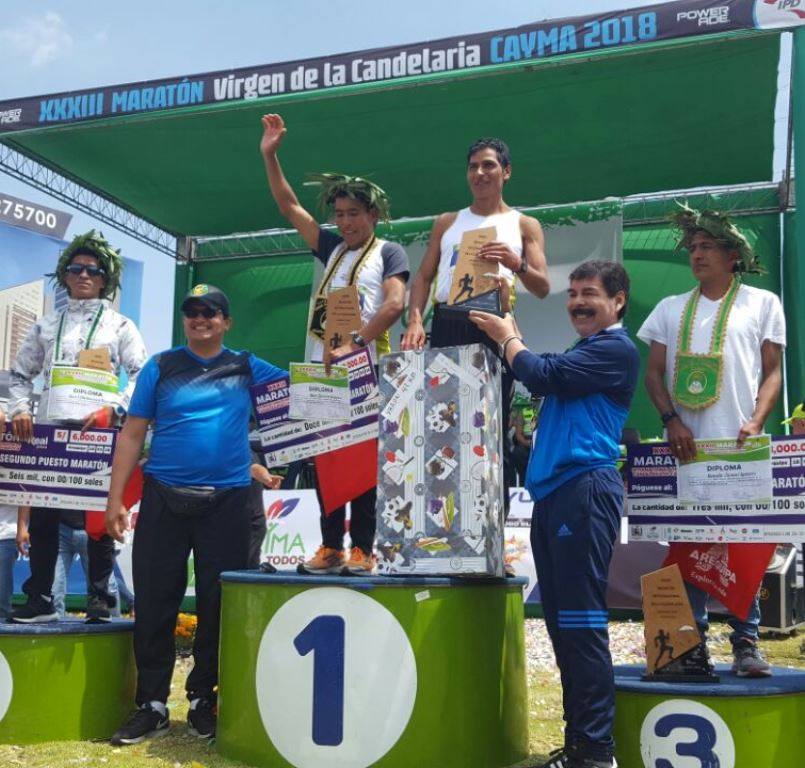 Este domingo se llevó la competencia internacional de Cayma Virgen de la Candelaria 2018 en la ciudad blanca de Arequipa , donde alcanzo el primer lugar de los 42 kilometros de la Maratón , 1er Lugar Max Belizario de Puno (2:22.00), 2do. Raúl Machacuay de Junín (2: 23.18) y 3ero. Ronald Paúcar de Huancayo ( 2: 26.49).