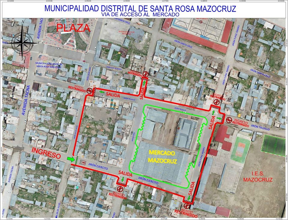 Según el esquema planteado para el ingreso y salida al centro de abastos de Mazocruz, como única vía de acceso será el Jr. Ejército, cada transeúnte deberá contar con el barbijo correspondiente, asimismo la desinfección externa a cada uno de ellos, quienes deberán permanecer un tiempo prudencial para realizar sus compras, las vías adyacentes al mercado estarán definidas únicamente como ruta de salida, tal es el caso de los jirones Trujillo, Túpac Amaru y Puno, medidas de restricción se ejecutará a partir de las 4:00 a.m.