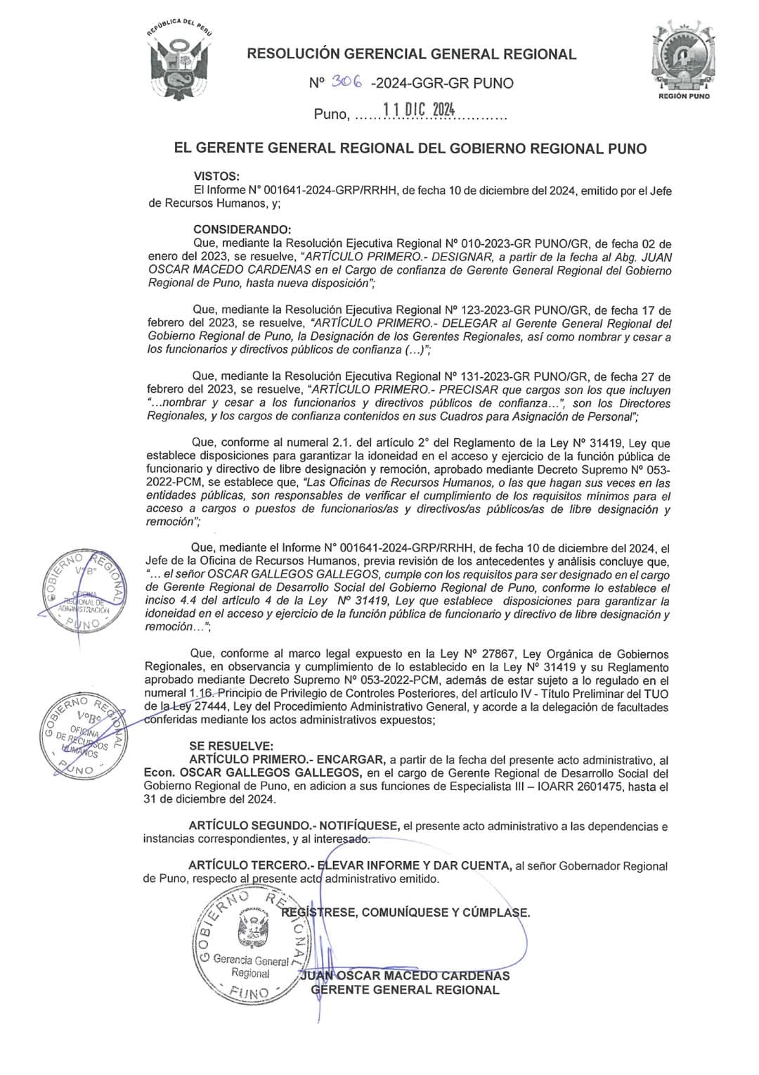La designación de Gallegos fue formalizada mediante la Resolución Gerencial General Regional N° 306-2024, emitida el 11 de diciembre de 2024. En el documento se establece que el economista asumirá esta nueva responsabilidad de confianza, sumándola a sus actuales funciones como Especialista III en el área de inversiones.