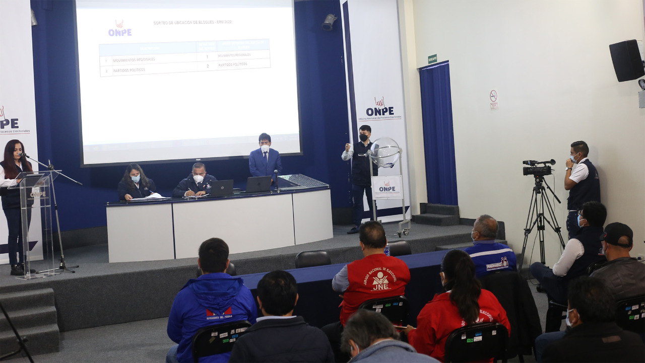 Según el sorteo del 31 de mayo, realizado en la sede central de la ONPE, el bloque de movimientos regionales ocupará el primer lugar en la parte superior de la cédula de sufragio, mientras que el bloque de partidos políticos estará ubicado en el segundo lugar.