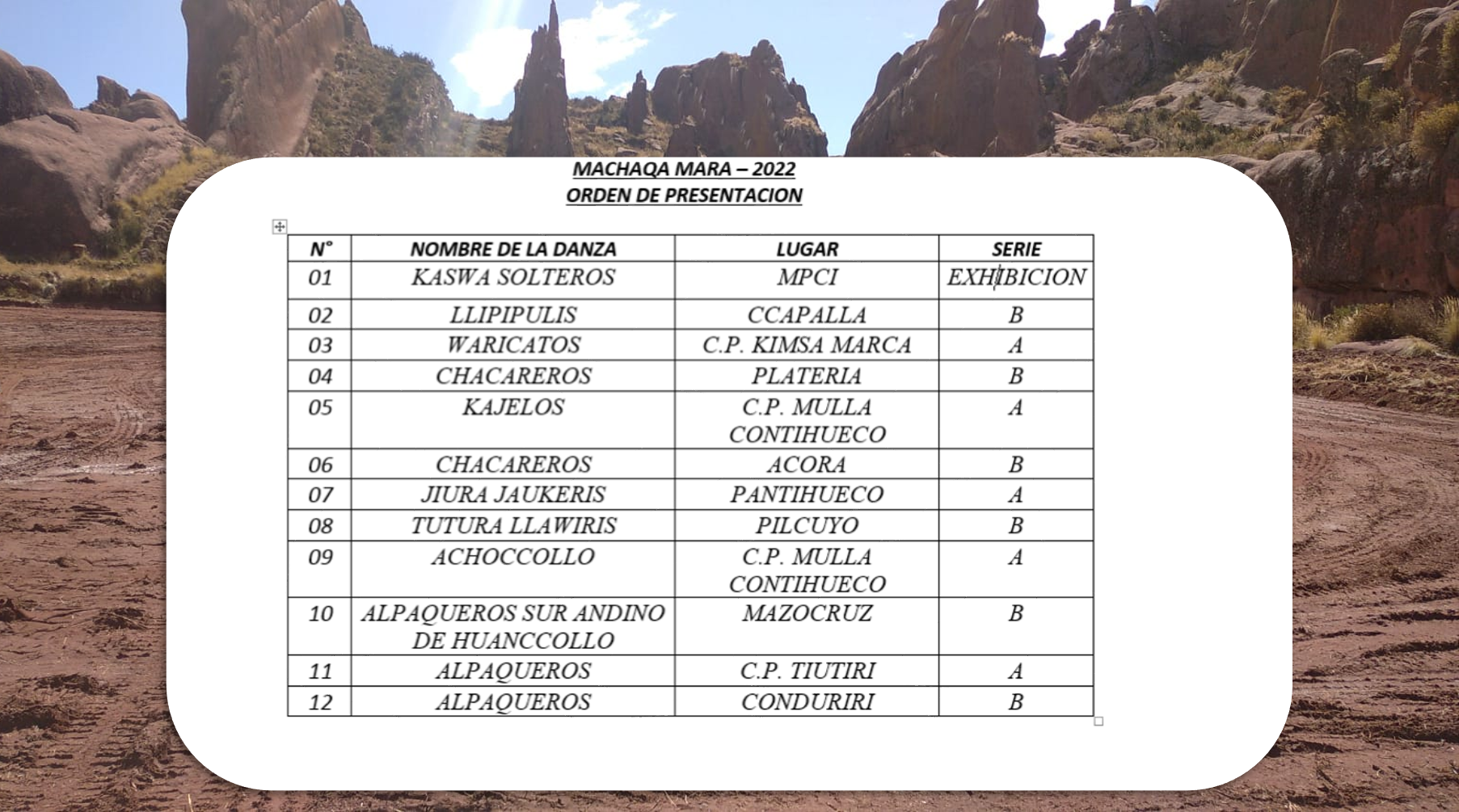 ORDEN DE PRESENTACION DEL CONCURSO DE DANZAS ORIGINARIAS MACHAQA MARA – MULLA CONTIHUECO 2022