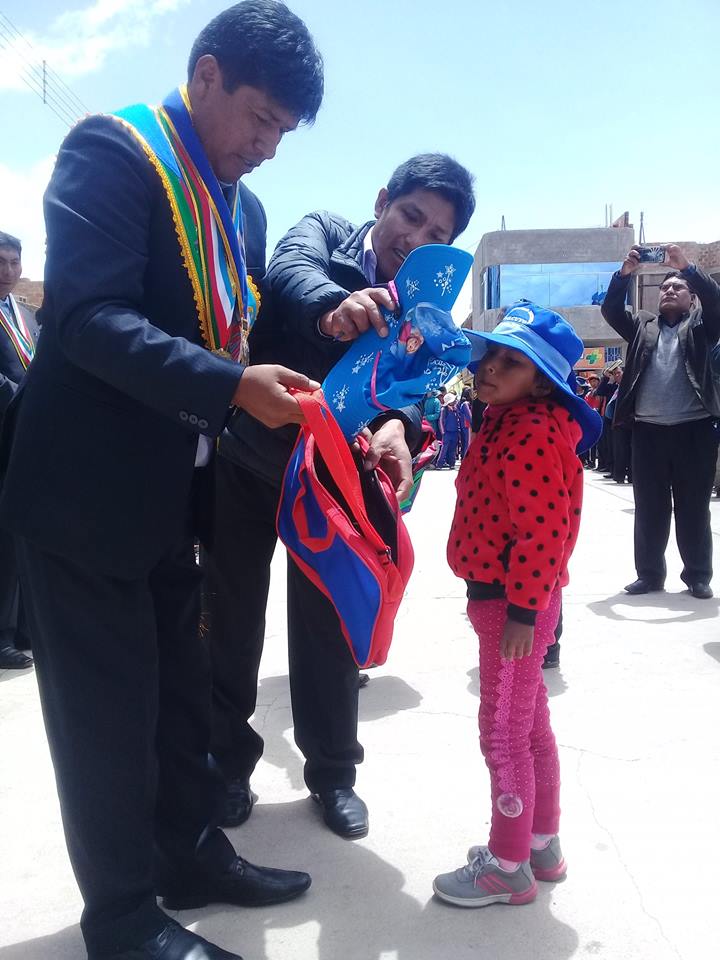 La campaña “En el cole me protejo del sol” se inició en los Niveles de Educación Inicial, Primaria y Secundaria, evento que se desarrolló en el frontis de la Municipalidad hasta donde, el alcalde Distrital Elmer Calliri Chura, personalmente entrego las Gorras y Mochilas.