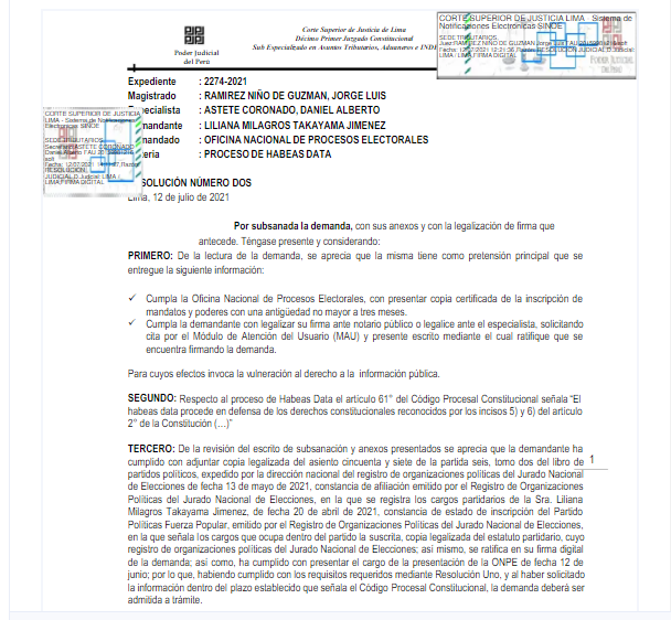 El 11° Juzgado Constitucional de Lima admitió a trámite el hábeas data interpuesto por Fuerza Popular contra la Oficina Nacional de Procesos Electorales (ONPE) donde se solicita la lista de electores por mesa de sufragio utilizada en la segunda vuelta de las Elecciones Generales de Perú de 2021.