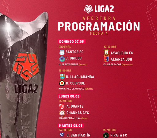 El próximo domingo (10/05) comenzará a disputarse la cuarta jornada del Torneo Apertura de la Liga 2, donde los líderes Alianza Universidad (+7) y Comerciantes Unidos (+4) tendrán acción en condición de visitante frente a Ayacucho FC y Santos FC, respectivamente.