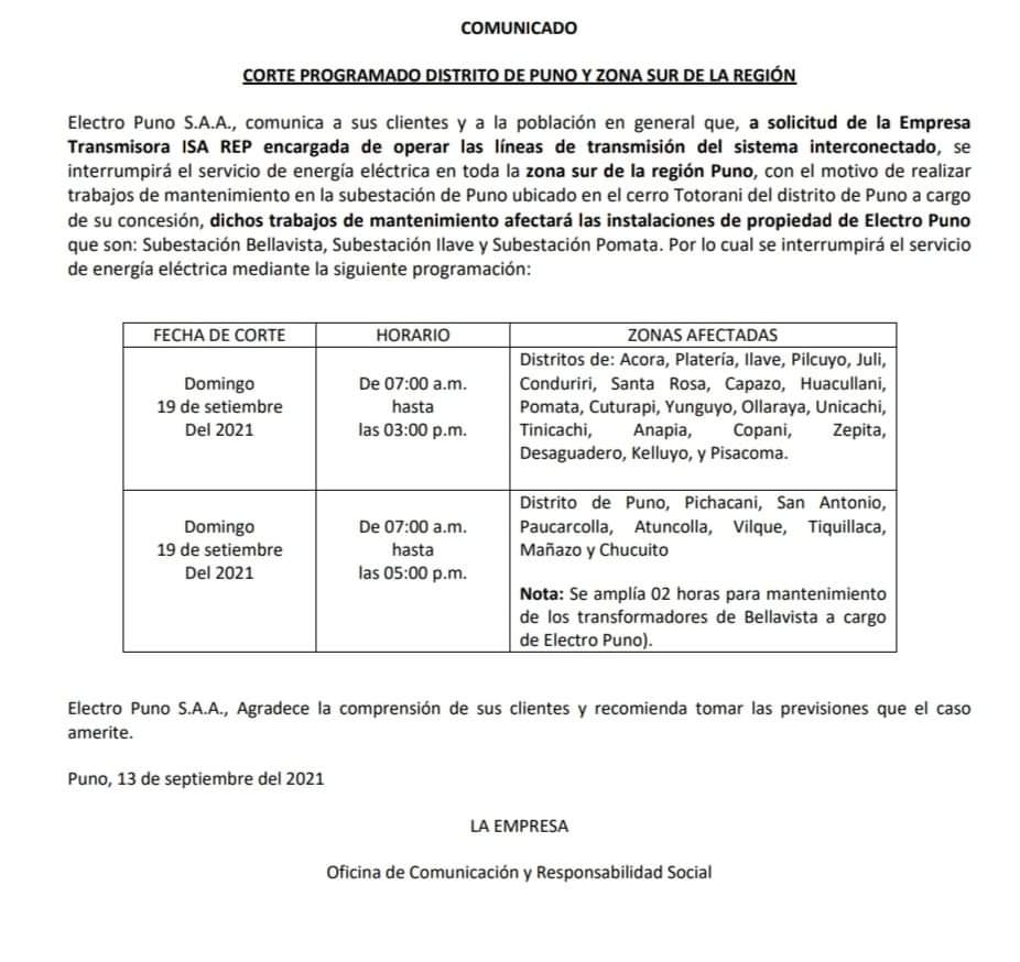 Por lo cual se interrumpirá el servicio de energía eléctrica mediante la siguiente programación: domingo 19 de setiembre de 7 a.m. hasta 3 p.m. Distritos de: Acora, Platería, Ilave, Pilcuyo, Juli, Conduriri, Santa Rosa, Capazo, Huacullani, Pomata, Cuturapi, Yunguyo, Ollaraya, Unicachi, Tinicachi, Anapia, Copani, Zepita, Desaguadero, Kelluyo, y Pisacoma.