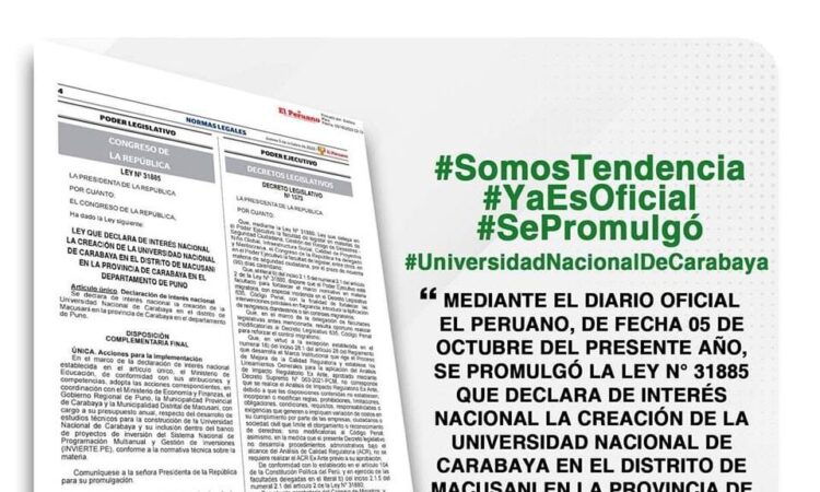 Este 5 de octubre, se publicó en el Diario Oficial El Peruano, la Ley Nº 31885, que declara de interés nacional la creación de la Universidad Nacional de Carabaya, en el distrito de Macusani.