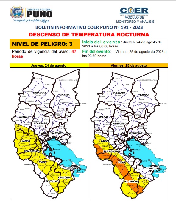 La Oficina Regional de Gestión del Riesgo de Desastres y Seguridad del Gobierno Regional de Puno ha emitido una alerta meteorológica para los días jueves 24 y viernes 25 de agosto. Se espera un descenso de temperatura hasta -15 °C en localidades sobre los 4000 m.s.n.m., con un nivel de peligro amarillo y naranja correspondientemente.