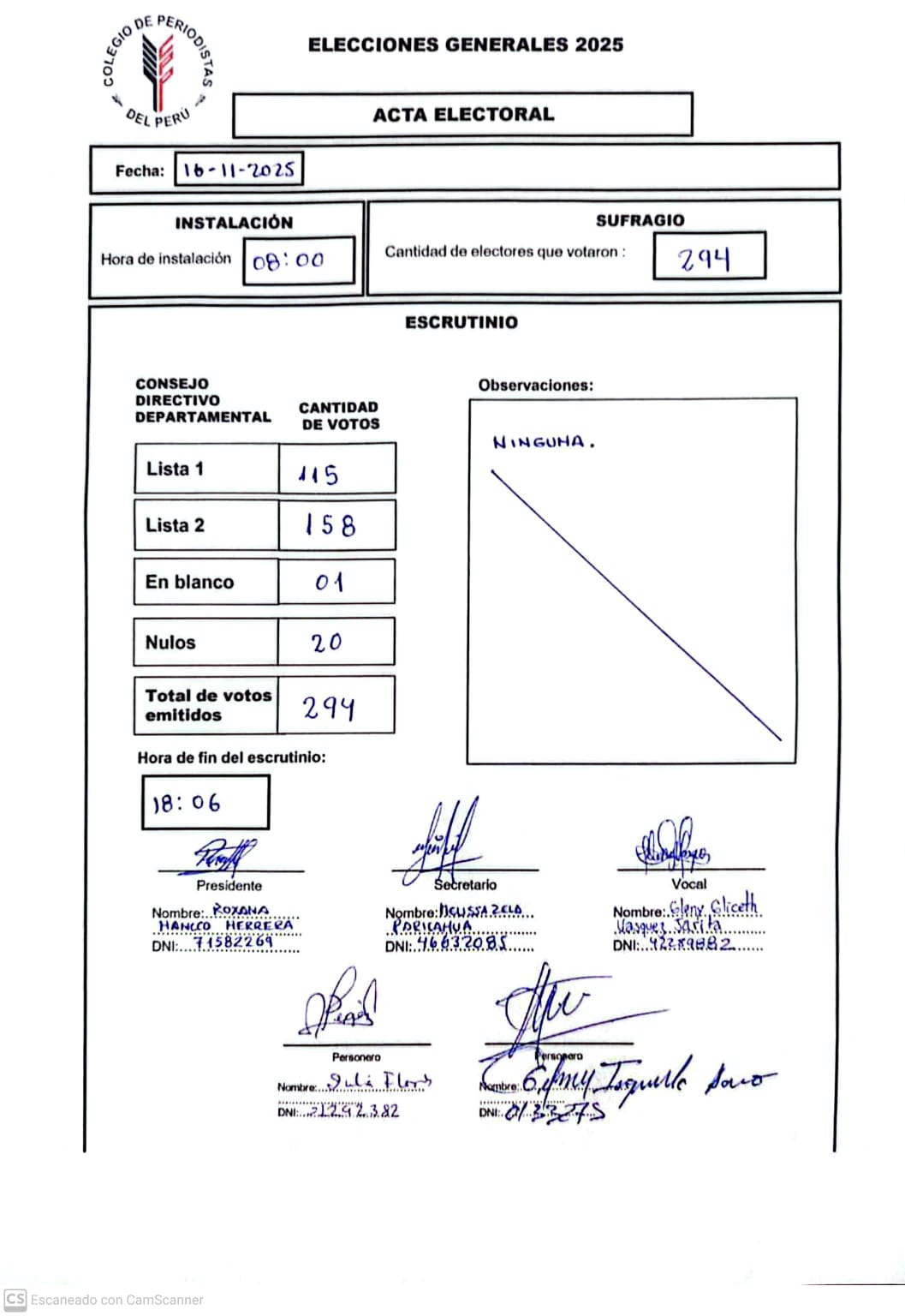 La Lista 2, encabezada por Quispe Chambi, obtuvo 158 votos, superando a la Lista 1, liderada por Romel Montesinos, que alcanzó 115 votos. El Comité Electoral reportó además 1 voto en blanco y 20 nulos, haciendo un total de 294 periodistas participantes. Cerca de 300 colegiados acudieron a sufragar durante la jornada.