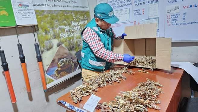 En el marco de un trabajo articulado recuperó 390 ranas del Titicaca (Telmatobius culeus) muertas y secas decomisado por personal de Aduanas durante una inspección de rutina a la altura de la comunidad de Huataquita, distrito de Cabanillas, en Puno, según informó el Servicio Nacional Forestal y de Fauna Silvestre (SERFOR), organismo adscrito al Ministerio de Desarrollo Agrario y Riego (MIDAGRI).