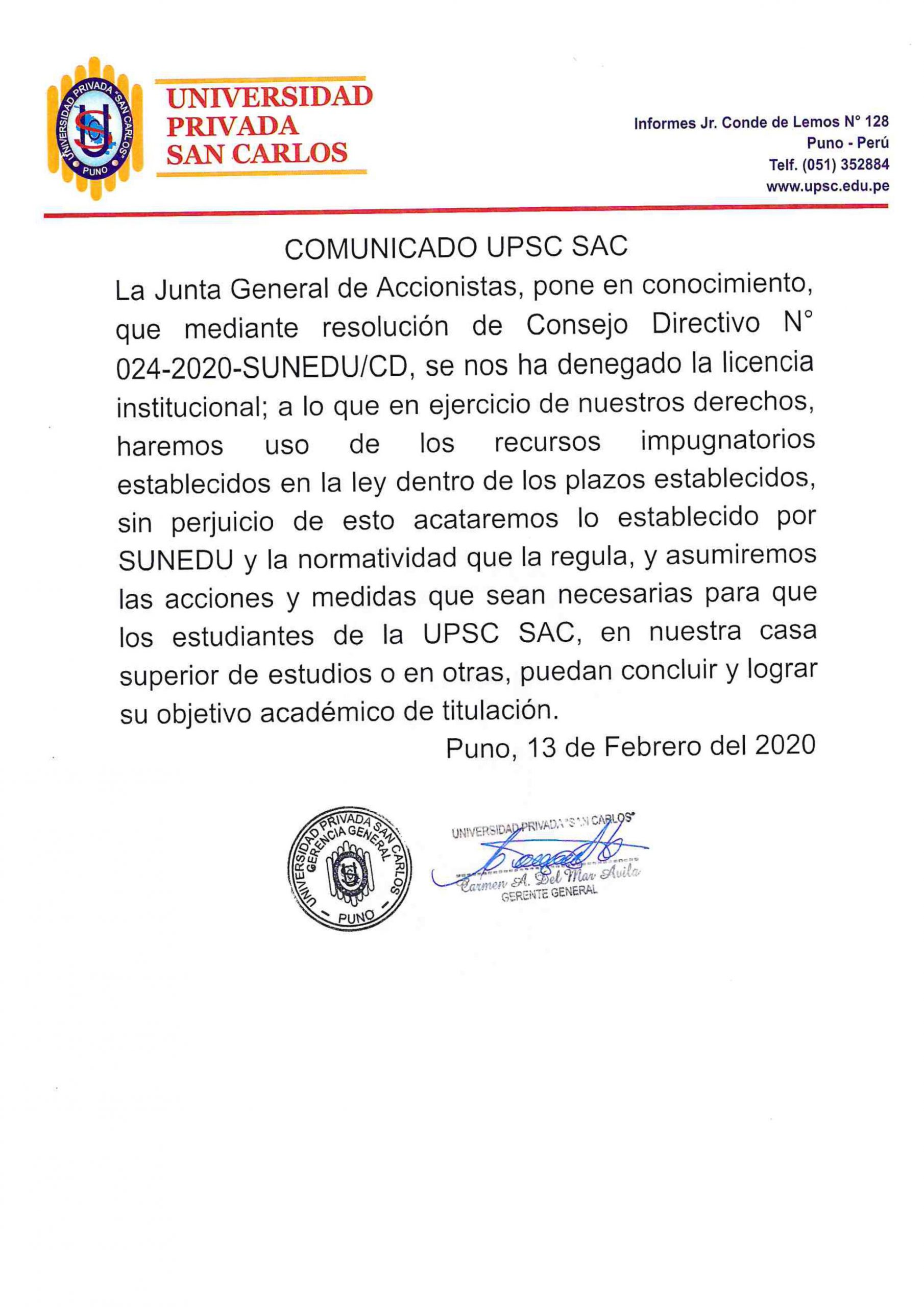 La Universidad privada San Carlos de Puno emitió un comunicado , donde anuncia que la SUNEDU lo denegó la licencia Institucional.