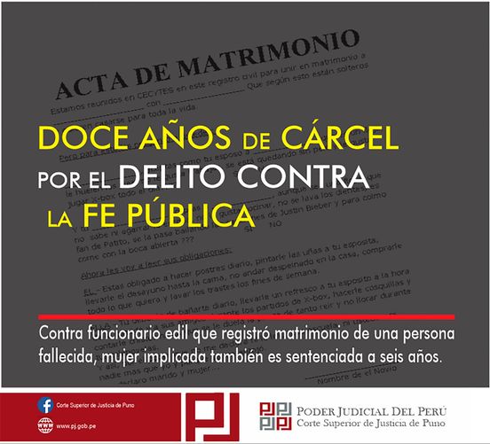 - Doce años de cárcel para funcionario que registró matrimonio de una persona fallecida, cuando se desempeñaba como jefe del Registro Civil de la Municipalidad de San Román.