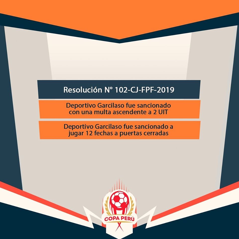 La Comisión de Justicia de la FPF informa mediante su resolución Nº 102-CJ-FPF-2019 que el club Deportivo Garcilaso fue sancionado con una multa ascendente a dos UIT y la obligación de jugar sus siguiente 12 partidos de local en la Copa Perú a puerta cerrada, como consecuencia de los incidentes ocurridos en el partido de vuelta de cuartos de final de la última Etapa Nacional.