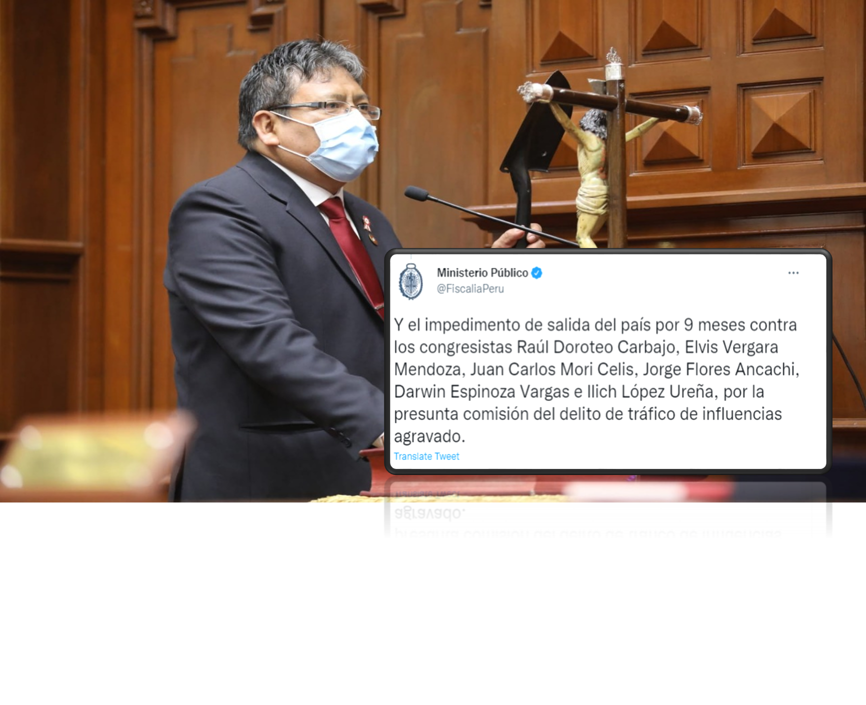El Fiscal de la Nación Pablo Sánchez solicita al Poder Judicial el impedimento de salida del país por 9 meses contra el congresista puneño Jorge Flores Ancachi, junto a él Ministerio Público cita a los parlamentarios de Acción Popular, Raúl Doroteo Carbajo, Elvis Vergara Mendoza, Juan Carlos Mori Celis, Darwin Espinoza Vargas e Illich López Ureña por la presunta comisión del delito de tráfico de influencias agravado.