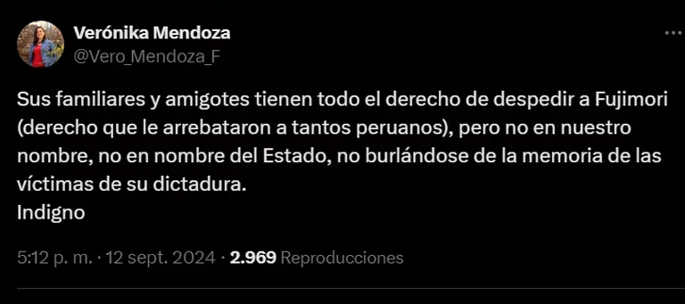 “Sus familiares y amigotes tienen todo el derecho de despedir a Fujimori (derecho que le arrebataron a tantos peruanos), pero no en nuestro nombre, no en nombre del Estado, no burlándose de la memoria de las víctimas de su dictadura”, sentenció.