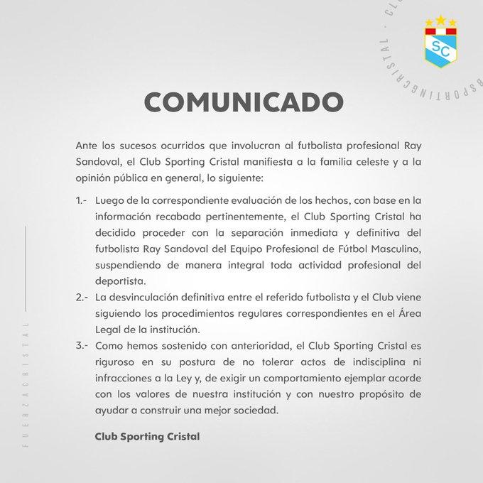«El Club Sporting Cristal ha decidido proceder con la separación inmediata y definitiva del futbolista Ray Sandoval del equipo profesional de fútbol masculino, suspendiendo de manera integral toda actividad profesional del deportista», publicaron en su comunicado.