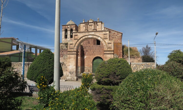 Desde su base hasta cierta altura, el templo muestra un cambio en el color de la piedra, evidencia del reaprovechamiento de los bloques originales. En su construcción se empleó calicanto como mortero, mientras que la parte superior de la torre y el arco principal fueron elaborados en sillar, posiblemente extraído de las canteras de Siraya.
