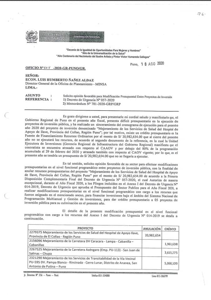 Con oficio N° 664-2020-GR-PUNO/GR, de fecha 18 de agosto del 2020, dirigido al Director General de la Oficina de Planeamiento del MINSA, el ilustradisimo Gobernador (e) Agustín Luque Chayña, solicita la Anulacion del presupuesto de 20.9 millones del Hospital de Apoyo de Ilave, para que este presupuesto se destine a otras obras de la Región, es decir, desviste un santo para vestir otros.
