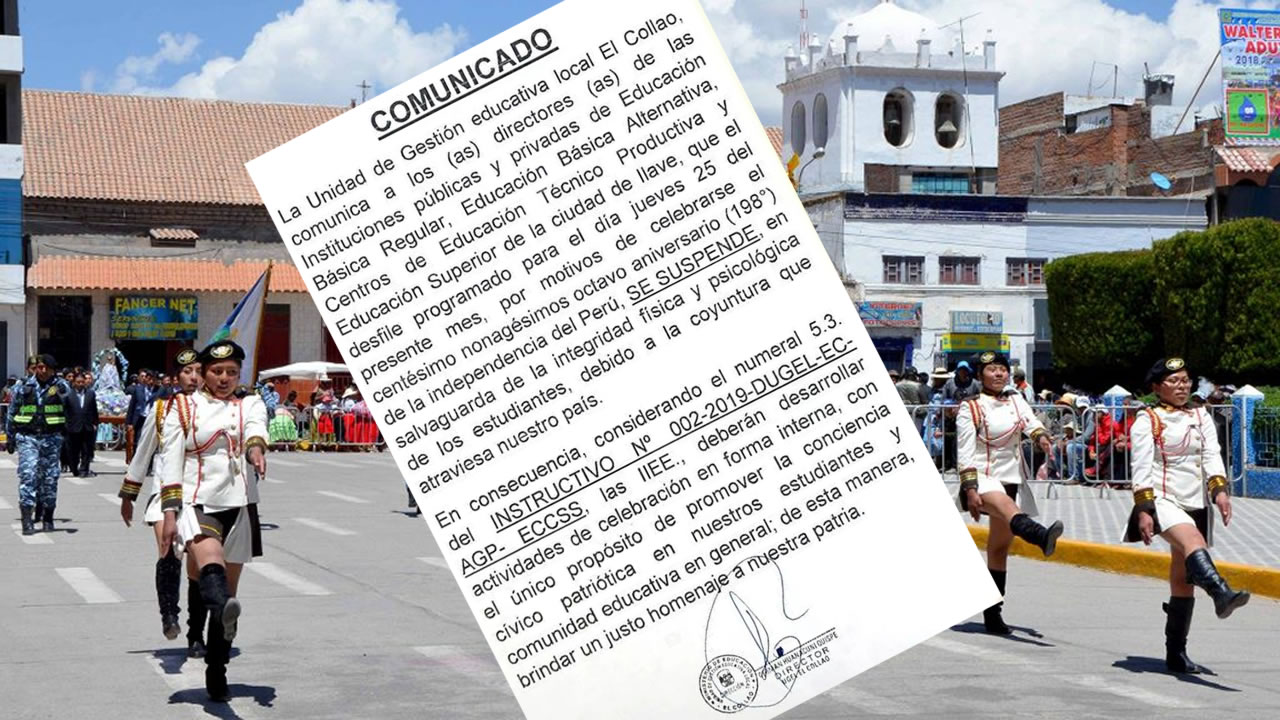 Más suspensión de actividades de aniversario patrio. Esta vez fue la Unidad de Gestión Educativa Local de El Collao, dispuso no realizar el desfile programado para el día jueves 25 de julio, en salvaguarda de la integridad físicas y psicológica de los estudiantes debido al 48 horas que se acatará en la macro sur.