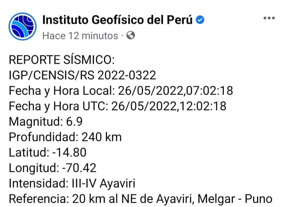El epicentro del sismo ocurrió a 20 kilómetros al Noreste de Ayaviri, Melgar (Puno), con una profundidad de 240 kilómetros.