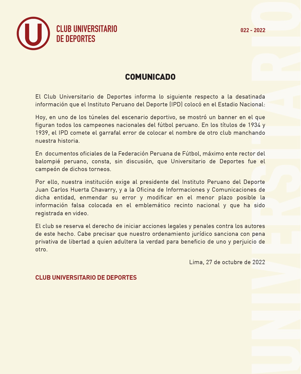 El club se reserva el derecho de iniciar acciones legales y penales contra los autores de este hecho. Cabe precisar que nuestro ordenamiento jurídico sanciona con pena privativa de libertad a quien adultera la verdad para beneficio de uno y perjuicio de otro”, señala el pronuniciamiento de Universitario.