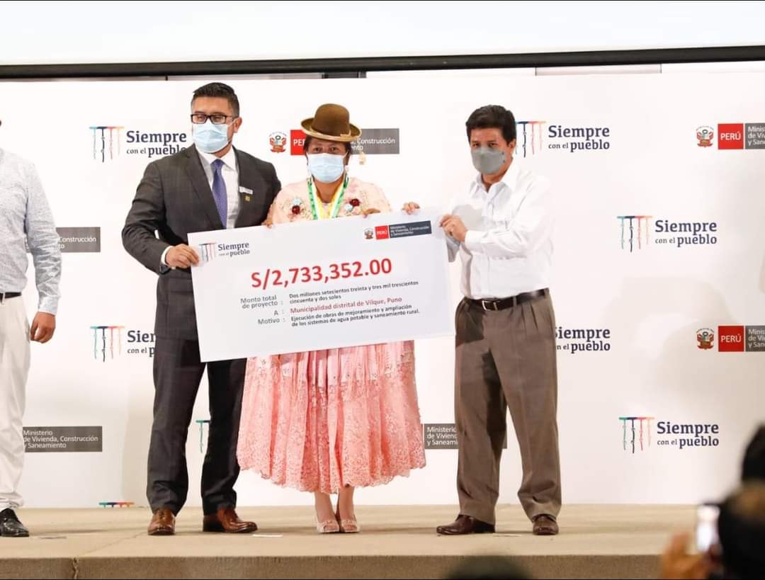 El presidente de la República, a través del Ministerio de Vivienda, Construcción y Saneamiento (MVCS), transfirió 2 millones 733 mil 352.00 soles a la municipalidad distrital de Vilque (Puno), para la ejecución de obras de saneamiento y mejoramiento de sus calles.