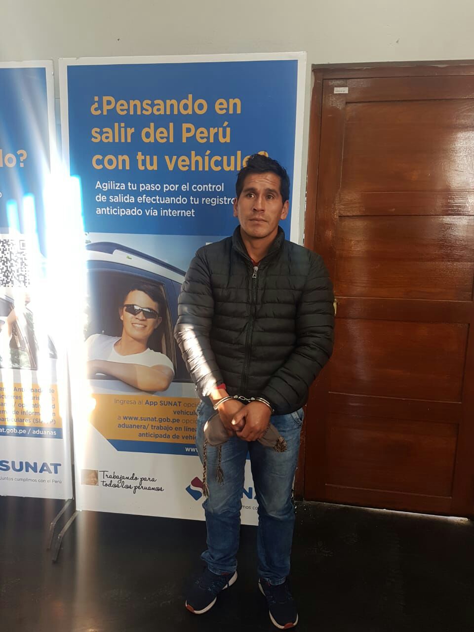 Al tener conocimiento los efectivos de la Fuerza Especial de Lucha Contra el Crimen en COPACABANA, inmediatamente iniciaron con un operativo a fin de capturar al traficante, por lo que al ingreso de dicha localidad, lograron interceptar un vehículo motorizado, de servicio público “taxi”, tipo vagoneta de color plomo con placa de control 2676-FLI, en cuyo interior se encontraba en calidad de pasajero, el ciudadano José Aníbal DIAS CHALLCO con DNI 47325780, de nacionalidad peruana, a quien al realizársele el chequeo personal e identificarlo, portaba un boleto de viaje de la Empresa Expreso Internacional TITICACA Bolivia S.C.R.L., por lo que evidentemente se trataba del sujeto a quien se buscaba, al ser interrogado en el lugar, esta persona se puso nervioso y admitió que había dejado una mochila en el referido ómnibus y que en el interior en forma camuflada efectivamente llevaba sustancias controladas, por lo que, conforme al convenio Internacional Binacional, suscrito entre los países hermanos de Perú y Bolivia, se cumplió con las respectivas diligencias haciéndose la entrega del referido sujeto a los efectivos policiales del Peru a eso de las 16:05 minutos aproximadamente.